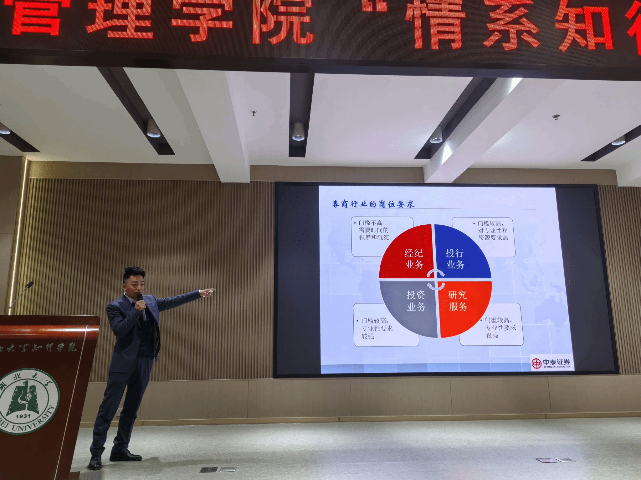 2025年12月6日,借着学校举办优秀校友“情系知行 聚力启航”活动的东风,经管学院诚邀2014届金融学专业优秀毕业生李成杰,精心为金融学子们奉上了一场关于《券商的未来与个人的职业发展》的专题讲座。