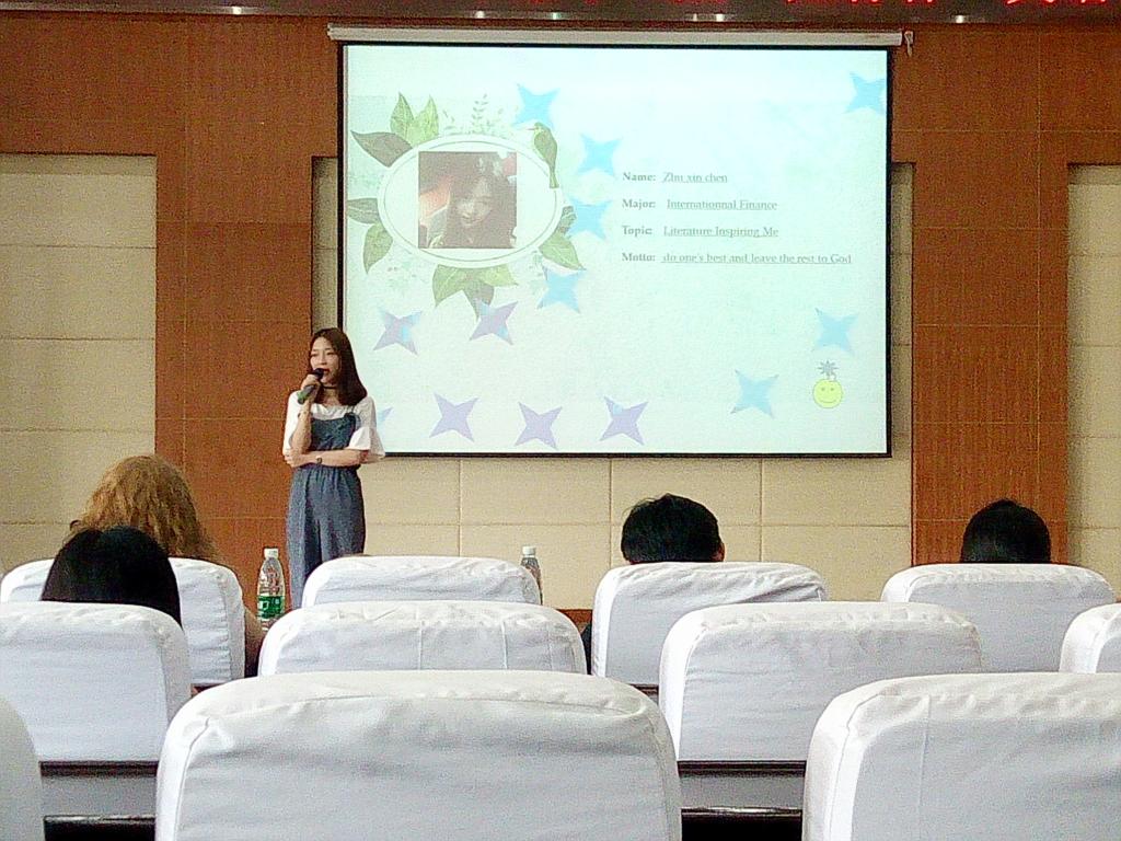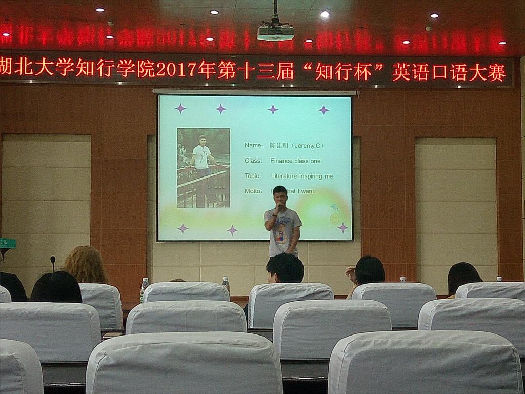 比赛分为定题演讲,即兴演讲,问答环节三个部分,总分为100分制。我系学子陈佳明同学在比赛中,一口流利的英语,扎实熟练的表演,从容的回答,在本次比赛中脱颖而出,I do what i want 这也是所他坚持的理由。