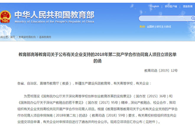 3月13日,教育部高等教育司发布《关于公布有关企业支持的2018年第二批产学合作协同育人项目立项名单的函》(教高司函〔2019〕12号),我院共有3项产学合作协同育人项目获教育部高教司立项支持。