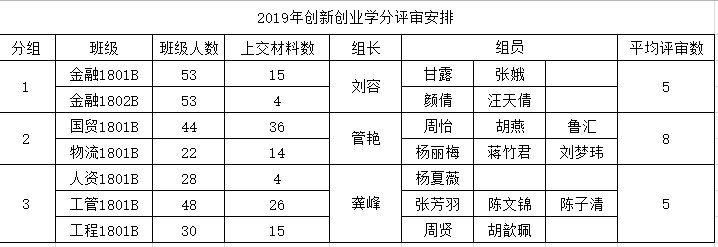 评审工作按照专业分为三组进行,三位领导分别担任组长。共对来自7个班级的114材料进行认定。