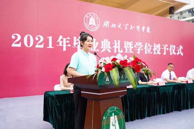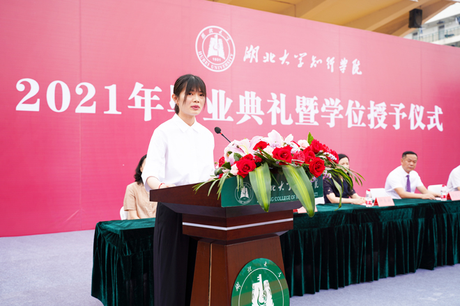教师代表王晗在发言中深情回顾了与同学们朝夕相处的大学愉快时光,对同学们在互联网时代所展现出来的自信、自主、自爱、自省、自立给予了充分肯定,鼓励同学们选择自己想要的体验,对外追求自己想要的时光,对内满足于所有的遇见,真正做到爱自己、爱生活、爱他人、爱世界,在未来的学习、工作、生活中全力以赴,不留遗憾。学生代表赵爽回顾了在知行求学期间的成长收获和感悟,分享了在学习生活中的难忘点滴和感受,表达了对母校和老师的感恩之情,并结合自己的成长成才经历与全体毕业生共勉:一是坚守初心,把自己最滚烫的年华奉献给自己最爱的事业,擘画国家壮美发展的新蓝图。二是脚踏实地,练真本领,做实干家,知行合一、脚踏实地,在坚定的选择中一步步接近自己的理想和抱负。三是勇担使命,把论文写在祖国的大地上,在祖国最需要的地方建功立业。