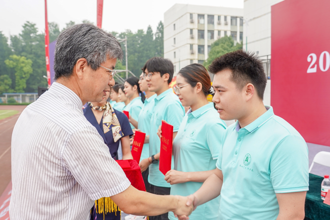 校党委书记彭德忠为优秀毕业生代表颁奖,祝福他们携带着沉甸甸的荣誉,在今后的学习和生活中,勇担时代重任,志存高远,脚踏实地,奋力谱写青春赞歌。