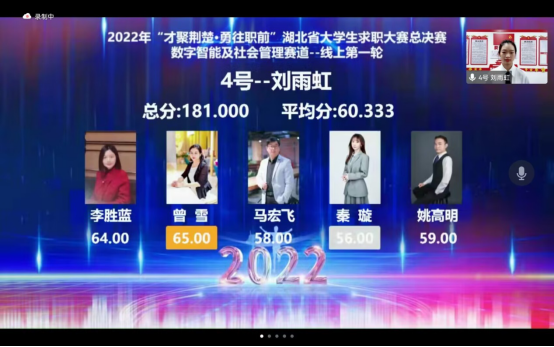 为贯彻落实党中央、国务院关于促进高校毕业生就业的决策部署和省委、省政府工作要求,11月19日,“才聚荆楚·勇往职前”湖北省大学生模拟求职大赛数字智能及社会管理赛道线上决赛落下帷幕,我校人力资源管理2001B班刘雨虹同学参加进行选拔。