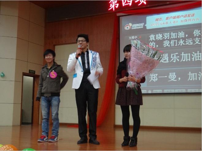 终于,12月4日晚六点半,我们迎来了经济与管理系“星光大道”K歌大赛决赛。五光十色的气球,精美的装饰无疑不体现着这次节目的精彩!激情四射的开场秀拉开了比赛的帷幕,激烈的比赛在期待中上演。第一轮的车轮战也逐渐的打响。《痴心绝对》、《忽然之间》等经典的歌曲萦绕在我们的脑间与心海。而马遇乐凭借着不俗的唱功获得了第一轮的绝对胜利!在下几轮的比赛中硝烟依旧弥漫!最终徐中亭,袁晓雨等4名选手进入了冠军的争夺战中,郑一曼凭借着优美的歌喉,打动了众位评委,获得了最后的胜利。最后郑一曼、马遇乐、袁晓雨分别获得第一名、第二名、第三名,并由他们各自的辅导员颁奖!
