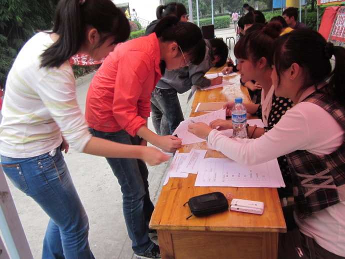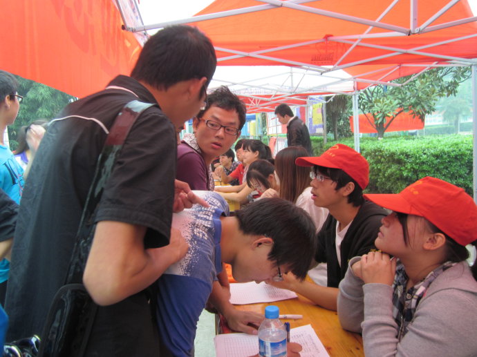 2011年10月12/13日。经管系分团委学生会在老食堂门口展开了为期两天的纳新活动。为了更好地服务于学生,为经管系分团委学生会注入新鲜血液。此次纳新活动吸引了许多新生的咨询与报名,相信11届新生的加入,会给我们经管系分团委学生会带来不一样的亮点。期待下一步的竞选结果吧。。。