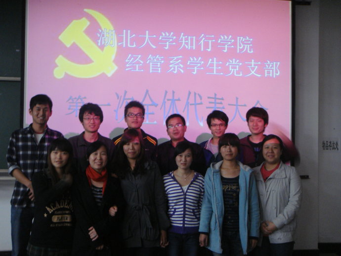 2010年11月11日晚7时湖北大学知行学院经管系学生党支部第一次全体代表大会在知新楼307教室隆重举行。经管系党支部书记高子章,组织委员钟明,宣传委员周晓,08届专科党小组组长温诗敏,09界党小组组长兼任09届监察刘新利出席本次大会。