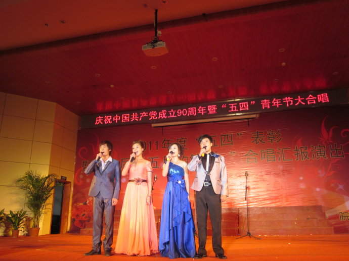 2011年5月4日下午2时30分, 由院里主办的中国共产党成立90周年暨“五四”青年节大合唱活动在我院行政楼201教室内如期举行.出席本次活动的嘉宾有刘刚院长,各系书记,主任,辅导员,院团委学生会,各系部团委学生会代表.优秀团员干部,各班团支书等. 在国歌奏响后进行了表彰大会. 3时左右,表彰大会结束,第五届“五月的鲜花”大合唱正式开始. 参加本次大合唱的有各系代表队,院广播台诗歌团及院艺术团合唱队。我系代表队演唱歌曲《南屏晚钟》,以及由老师们带来的合唱。活动与4时30分左右圆满结束。