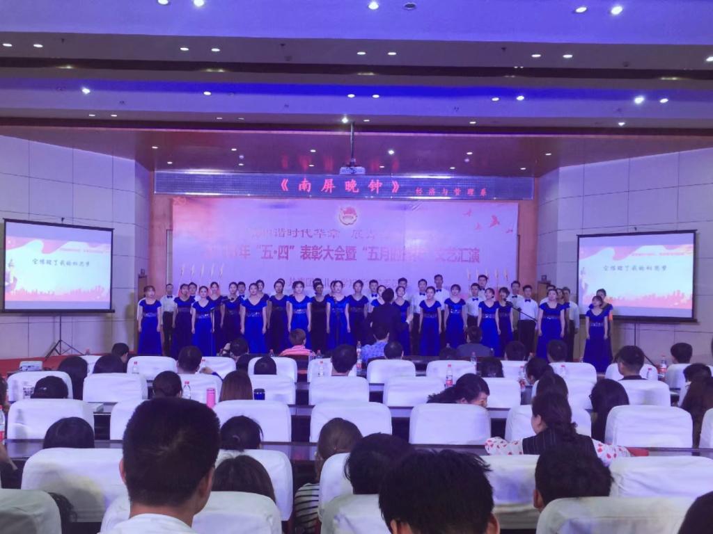 表彰大会结束后,五月鲜花合唱文艺汇演随之拉开了帷幕,优美动听的旋律响起。我系合唱团带来了《南屏晚钟》,“南屏晚钟,随风飘动……”42位成员,分了四个声部,演绎出了宋词的雅韵,旋律宛转悠扬,就像走出了丛丛树林,看见了天边的夕阳红。美妙的歌声赢得了观众阵阵掌声。最终,我系合唱的《南屏晚钟》以95.33取得了第一名的成绩。