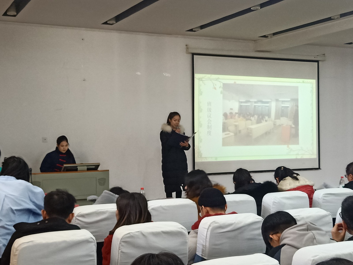 各个班级代表上台通过讲解PPT展示入学后班级取得的各项成绩,将班级的最亮点展现出来。有的班级在团建工作表现突出,有的班级在文化建设上提出自己独到的践行经历,有的班级以强大的学术成果显示着班级的学风建设......