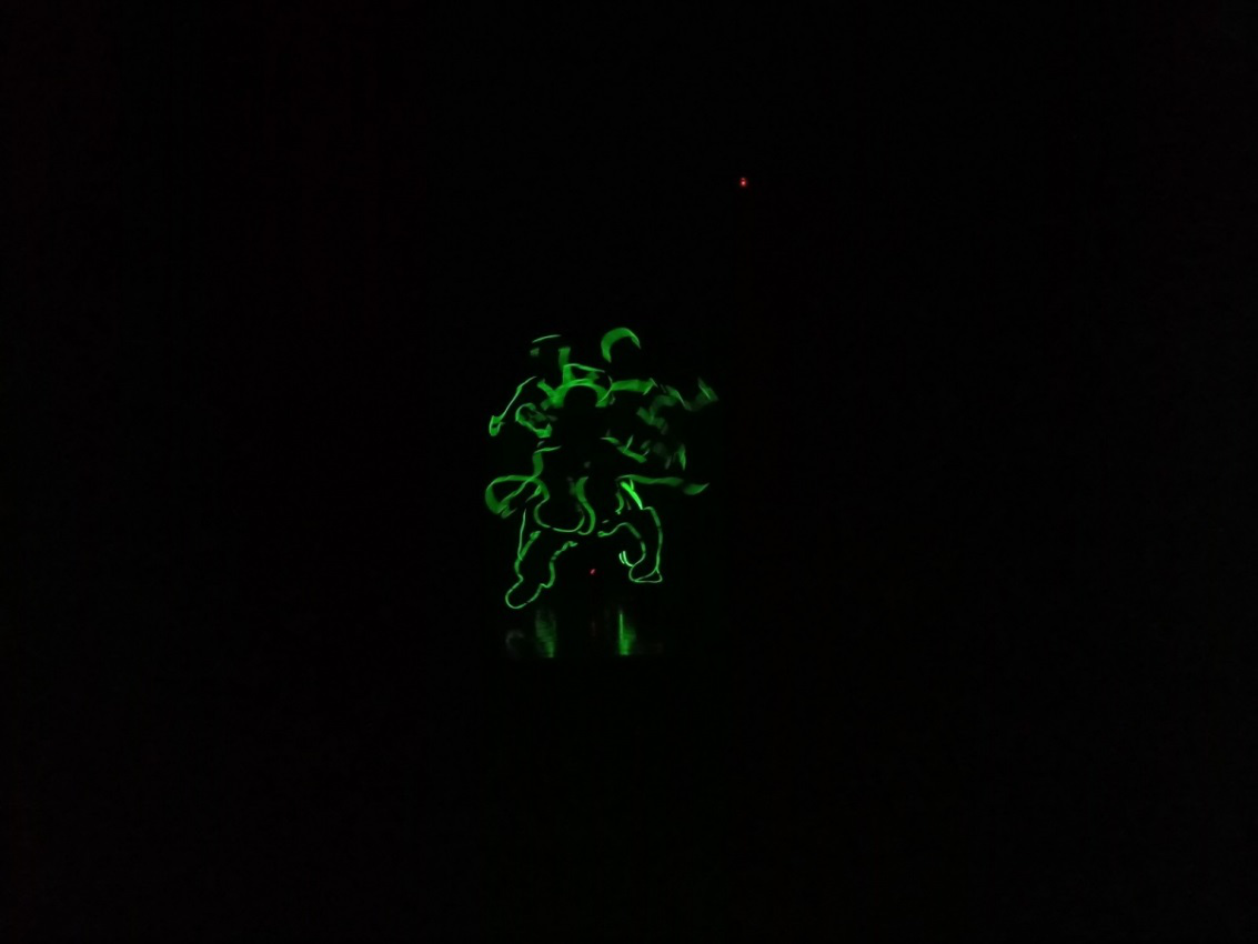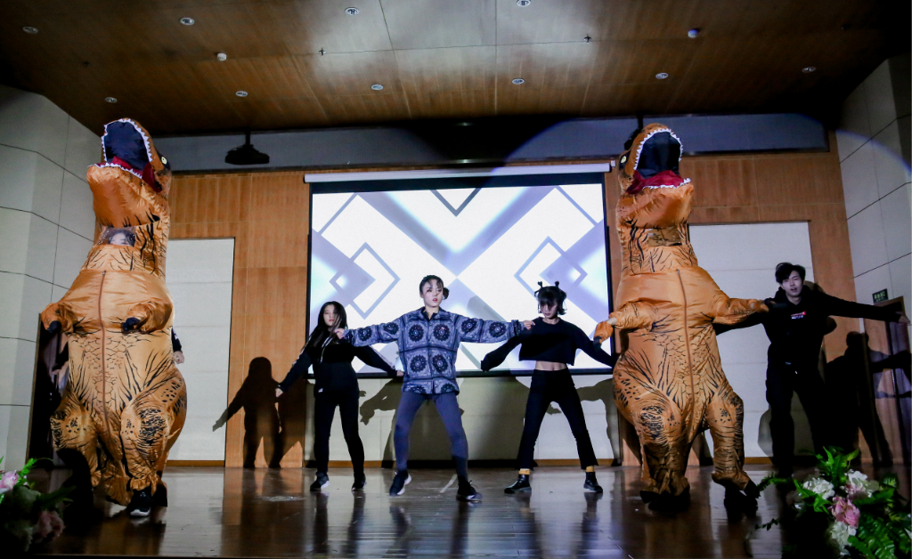 当精灵拉上夜幕,绿色的荧光浮现,视觉的冲击带来惊艳的舞台效果。接下来就经管系分团委学生会文艺部舞蹈队为我们带来的《霸王龙联盟》!整齐的步调,动感的舞姿。跳的不是一段舞,而是一种心情!