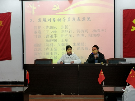 第三项是接收预备党员大会,首先曹璐成等25位发展对象宣读志愿书并提出入党志愿,然后发展对象辅导员发表意见,依次是管艳老师,董逸老师等7位辅导员就25位发展对象在学习等方面进行了总结,同意以上25位发展对象转为预备党员,25位发展对象的入党介绍人发表了意见,同意以上发展对象转为预备党员。而后,支委会讨论并发表对发展对象的审议意见,并进行表决,同意曹璐成等25位发展对象转为预备党员。