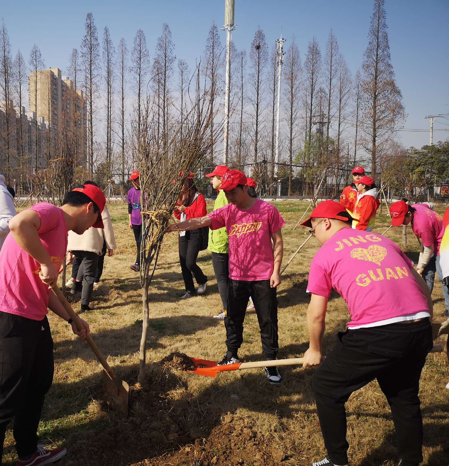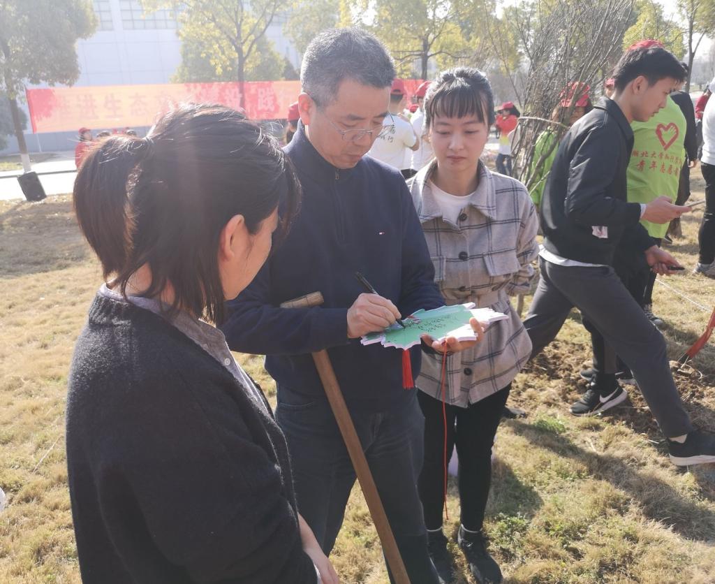和风送暖,风华正茂,又到春光明媚种树时。第41个植树节来临了,为促进校园绿化,增强广大师生的生态和环保意识,3月12日上午, 学院领导和各系志愿者们在体育馆后方草坪进行了植树活动。领导、老师们热情高涨,撸起袖子,挥锹铲土,扶苗填坑,踏土夯苗,齐心协力栽下一棵棵树苗,植树现场一片忙碌,一派火热。志愿者们衣着小红粉,头戴小红帽,朝气满满的和老师们一起参与了植树。