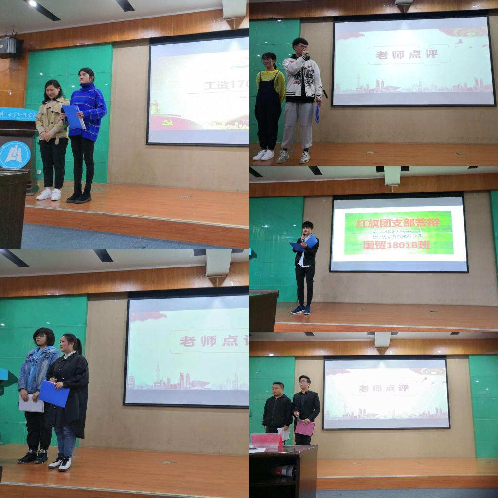 本次评选活动共有30个团支部递交申请材料,我院分团委对每个团支部的材料审核并打分,最后确定11个支部进入最后决赛。11个团支部进行了现场展示,通过PPT及视频的形式,对班级团支部工作进行汇报,讲述了一年以来的班级的进步和未来的展望。评委老师也针对各支部的思想引领、活动效果、现场表现等方面进行打分,最终将团委评分和展示得分综合后,营销1701专,工造1701本,金融1701本和国贸1801本获得“红旗团支部”荣誉称号。望以上支部戒骄戒躁,在全院传播着青春的活力和正能量。