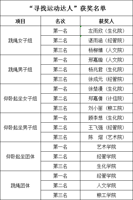 此次“寻找校园运动达人”在我校九个学院的积极参与中圆满落幕,各学院都收获满满。此次活动的开展不仅展示了学校运动健儿良好的身体素质,而且磨砺了学生的意志品质,进一步增强了各学院学生的凝聚力,展现了学生的精神风貌,培养了学生勇于争先、团结协作的精神,增强了集体荣誉感。生命不息,运动不止,让我们铭记这份精彩。