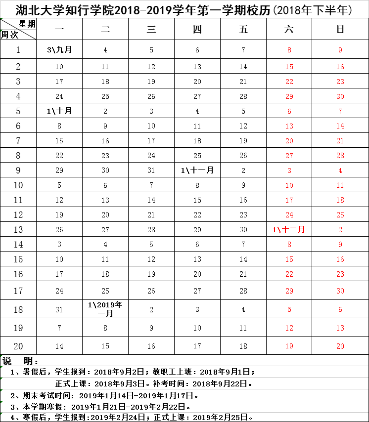 湖北大学知行学院2018-2019学年第一学期校历(2018年下半年)