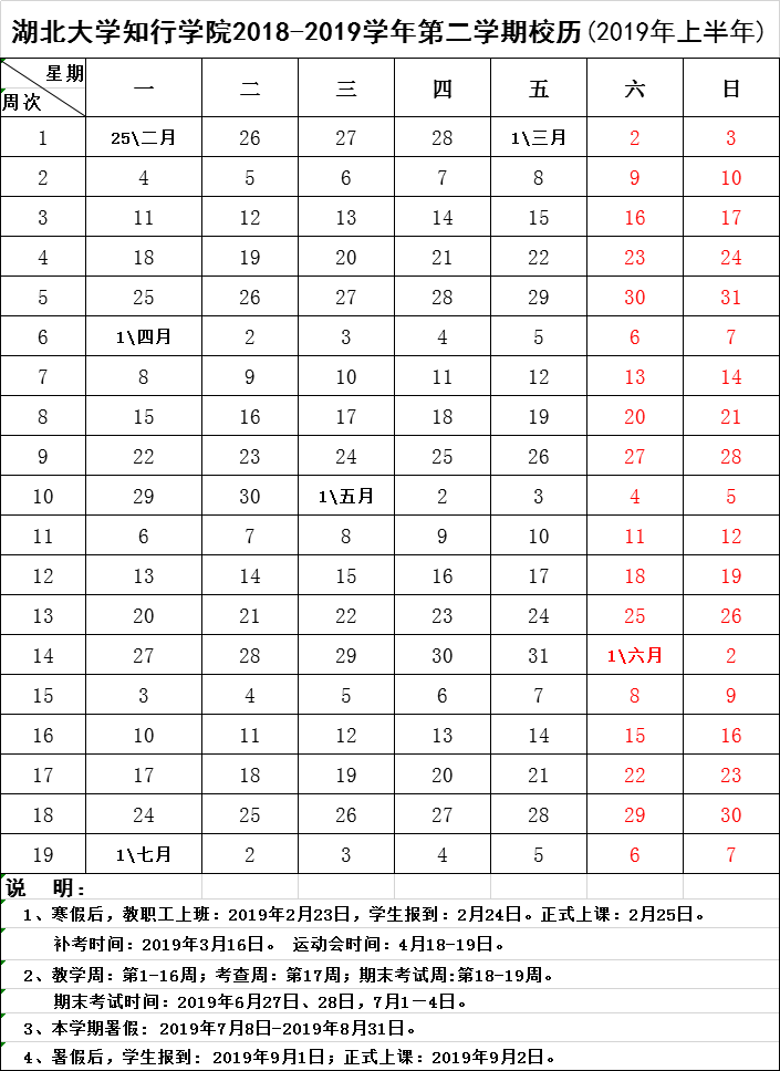 湖北大学知行学院2018-2019学年第二学期校历(2019年上半年)