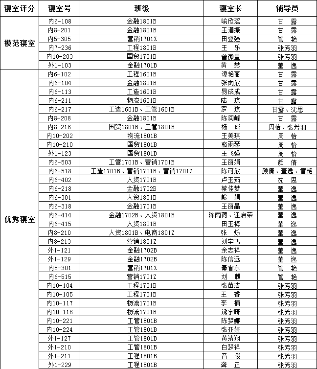3月14日,辅导员老师以及自律部学生干部对全系187间寝室卫生进行检查和评分,评选出模范寝室6间、优秀寝室34间,名单公布如下: