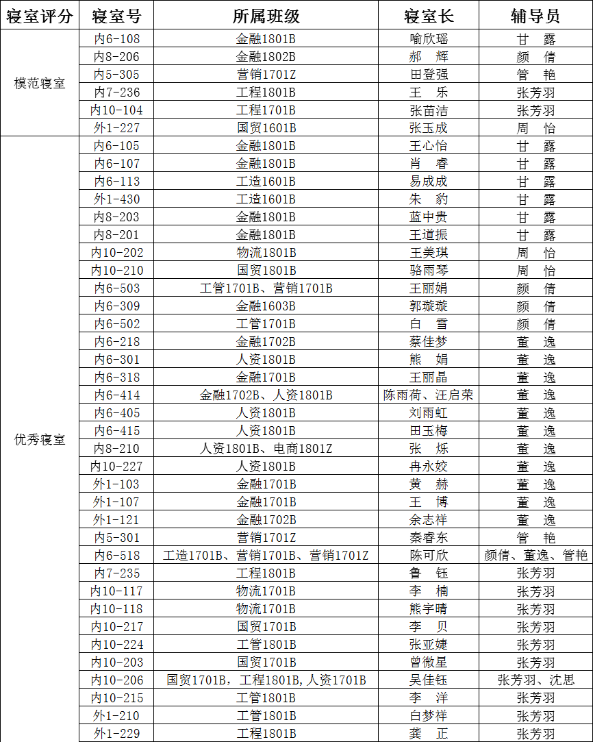 3月21日,经管系全体辅导员老师以及自律部学生干部对我系187间寝室卫生进行检查和评分,评选出模范寝室6间、优秀寝室34间,望同学们向模范及优秀寝室学习。现将名单公布如下: