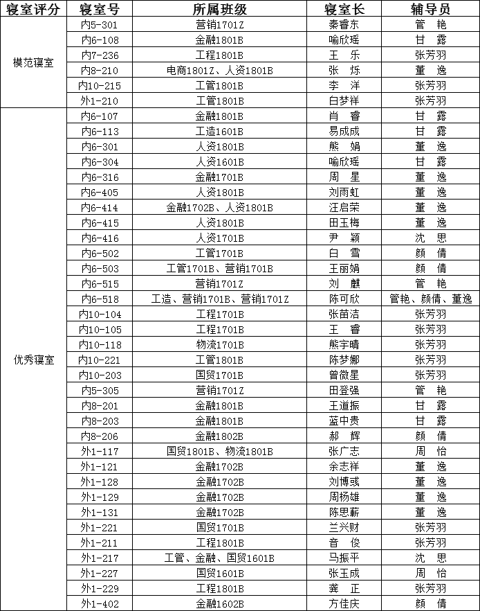 4月11日,经管学院全体辅导员老师以及自律部学生干部对学院187间寝室卫生进行检查和评分,评选出模范寝室6间、优秀寝室33间,望同学们向模范及优秀寝室学习。现将名单公布如下: