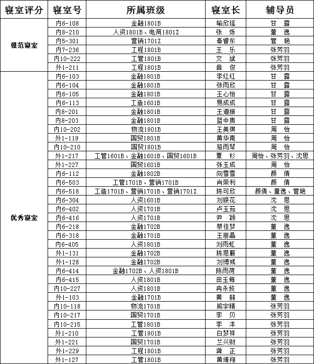 4月25日,经管学院全体辅导员老师以及自律部学生干部对学院187间寝室卫生进行检查和评分,评选出模范寝室6间、优秀寝室33间,望同学们向模范及优秀寝室学习。现将名单公布如下: