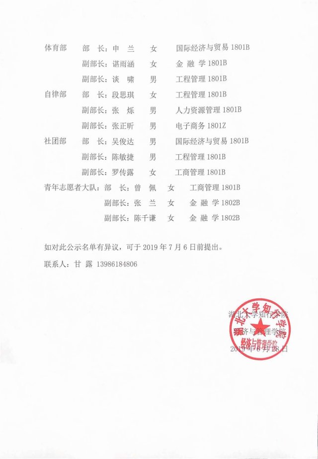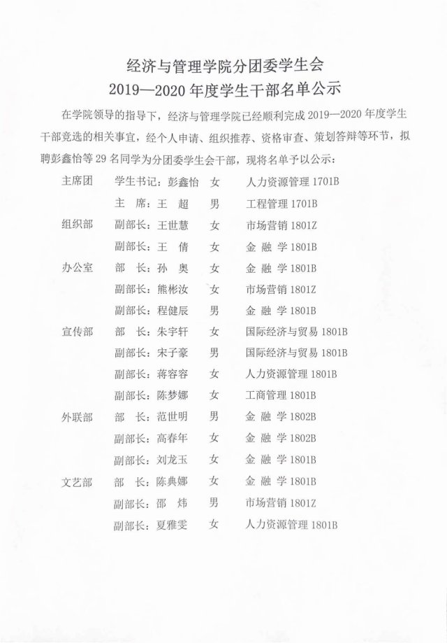 经个人申请、组织推荐、资格审查、策划答辩,现将经济与管理学院分团委学生会第十届干部名单公布如下:
