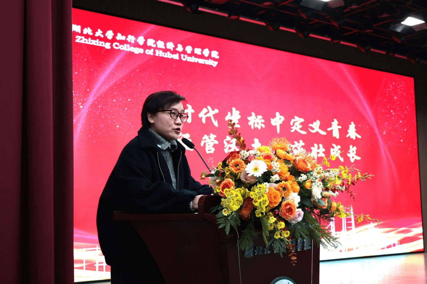 文艺展演再添精彩。傅丽书记与刘紫怡、欧阳雨甜等同学共同带来的朗诵《红曜聚微光,青春赴远方》。他们饱满真挚的情感,诉说着新时代青年的理想与担当,字字句句直抵人心,深深打动了现场每一位观众。
