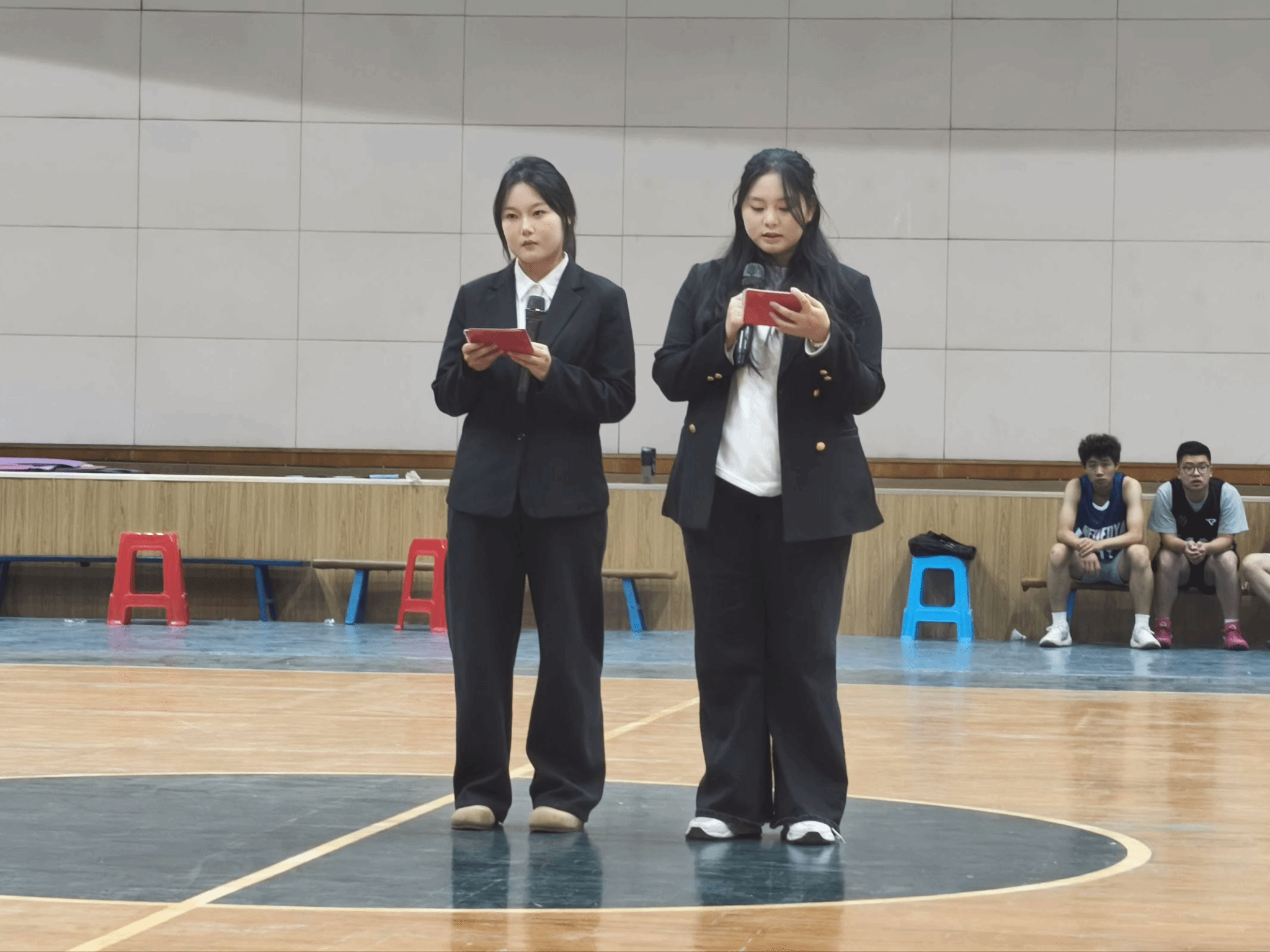 闭幕式现场星光熠熠,副院长周贤,学生会指导老师艾丽亚,辅导员胡瑞翔、沈佳圆等领导莅临观赛,全体运动员、裁判员及学生代表齐聚一堂。主持人杜光蝶与余怡携手拉开活动序幕。