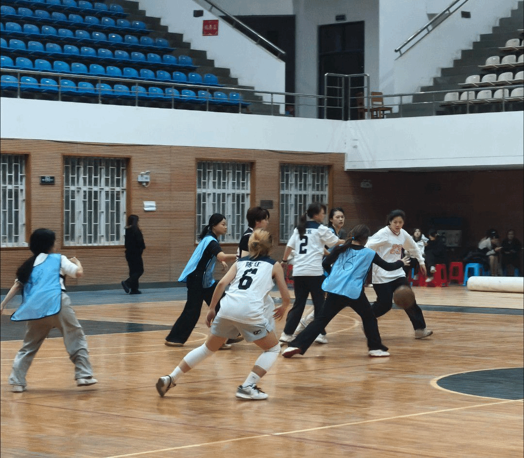 在第一项"新生杯"篮球友谊赛环节,男子,女子组经管老生队与新生队的对决精彩纷呈。参赛队员们发扬"友谊第一、比赛第二"的体育精神,场上奋力拼搏,场下友好交流,充分展现经管学子昂扬向上的精神风貌。中场休息时,文艺部带来的舞蹈《日不落》更是将现场气氛推向高潮。