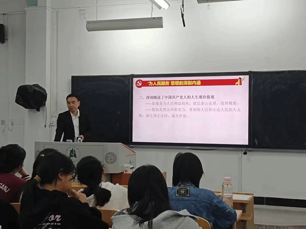 随后,刘副校长讲解了为人民服务的深刻内涵,重点指出“全心全意为人民服务,容不得半分敷衍,必须是纯粹的、毫无保留的。我们共产党是为绝大多数人民谋福祉,绝非为少数群体服务!” 他进而阐明党的宗旨就是全心全意为人民服务。接着,刘副校长谈及自己的入党动机,结合自身实际说到“首先要坚持贯彻立德树人的根本任务,其次做到‘为党育人,为国育才’‘听党话,跟党走’,在工作中慢慢修正自己的人生观和价值观”,深刻阐述了中国共产党人的人生观价值观。然后说道在日常生活中要做到‘吾日三省吾身’,及时反思,由此深刻阐述了中国共产党人如何对待自身不足和开展批评与自我批评。举例说明淮海战役的胜利是老百姓用小推车推出来的,号召我们要团结一心,从而深刻阐述了面对困难挑战加强团结奋斗的重要性。同学们认真倾听,仔细感悟,加深了对为人民服务的理解。