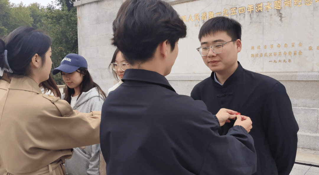 研学之旅的最后一站,是汉口江滩的防汛纪念碑。纪念碑上,1954年武汉人民众志成城、抗击特大洪水的浮雕栩栩如生,仿佛将那段万众一心、不畏艰险的历史重现眼前。全体成员在浮雕前整齐列队,齐声朗诵原创诗歌《红曜行·怀“两弹”忆“长征”》。“忆往昔,两弹惊雷震寰宇;看今朝,长征精神永相传……”激昂的诗句、真挚的情感,既是对革命先辈无畏精神的致敬,也是对新时代青年使命担当的宣告。朗诵结束后,现场举行了温馨而庄重的“党徽交接”仪式。老党员们小心翼翼地取出党徽,郑重地为新一批预备党员佩戴在胸前,指尖的温度传递着信仰的力量,寓意着红色基因在代代相传中永葆活力。