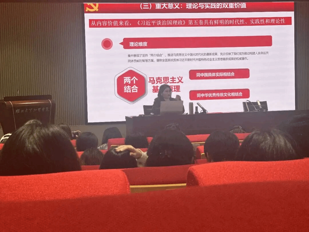 官翠娥教授在开篇指出,《习近平谈治国理政》第五卷是全面系统反映习近平新时代中国特色社会主义思想的权威著作,是新征程上筑牢理想信念、强化理论武装的重要教材。她以“把握重大意义、梳理核心要义、领会实践启示、凝聚奋进力量”四个维度为主线,引导学员深入理解著作内涵。