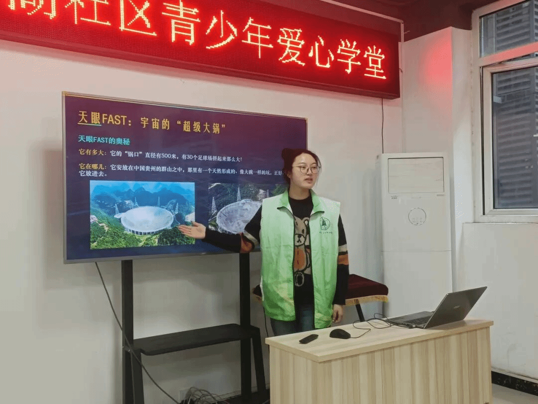 课堂伊始,主讲人欧阳雨甜以图文并茂的PPT为载体,将“中国天眼”FAST这一“宇宙超级大锅”生动地展现在孩子们面前。“这个‘大锅’有30个足球场那么大,藏在贵州的深山里,就像一个宇宙的大耳朵,专门听星星说悄悄话!”当听到宇宙的“悄悄话”是微弱的无线电波,必须用超级灵敏的“耳朵”才能捕捉时,孩子们睁大了眼睛,仿佛在想象那只在远方唱歌的“小蚂蚁”。