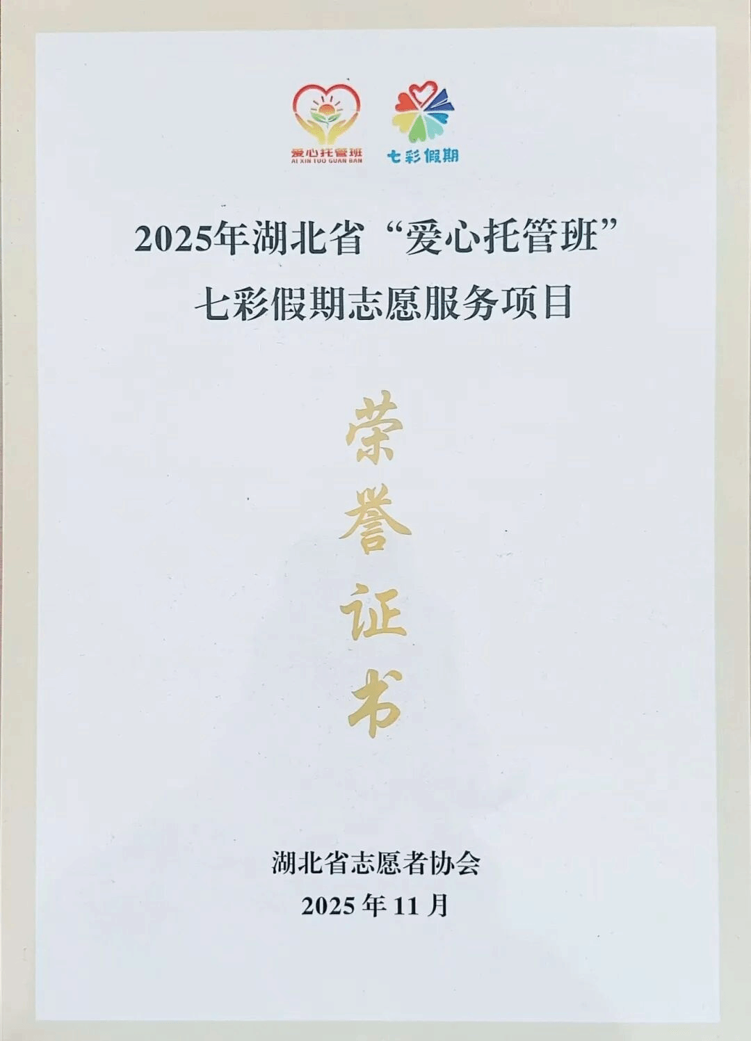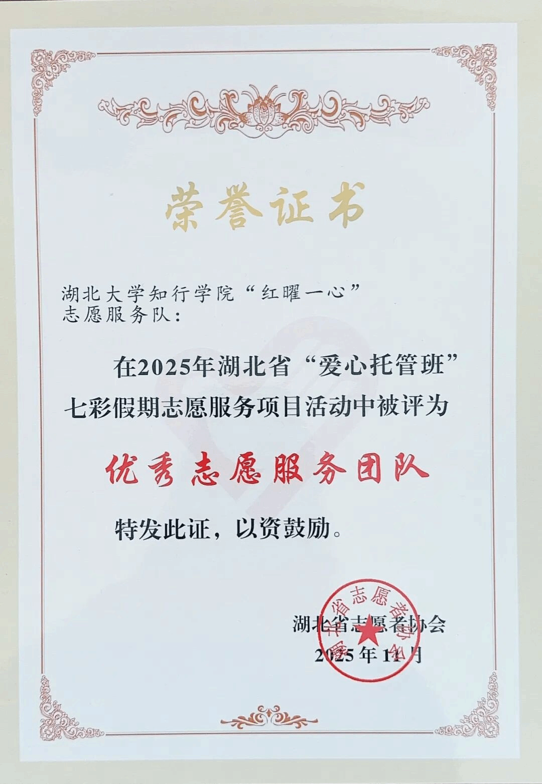 以青春为笔绘实践答卷,以热忱之心暖童心成长。近日,我院“红曜一心”志愿服务队凭借扎实的“爱心托管”服务实践、饱满的志愿热情和亮眼的服务实效,在全省千余支参与“七彩假期”志愿服务项目的团队中崭露头角,成功入选湖北省省级优秀团队,成为彰显青春担当的鲜活力量!这份认可,是他们用真心浇灌出的荣誉勋章,更是对每一份坚守与付出的最佳印证!